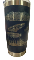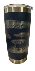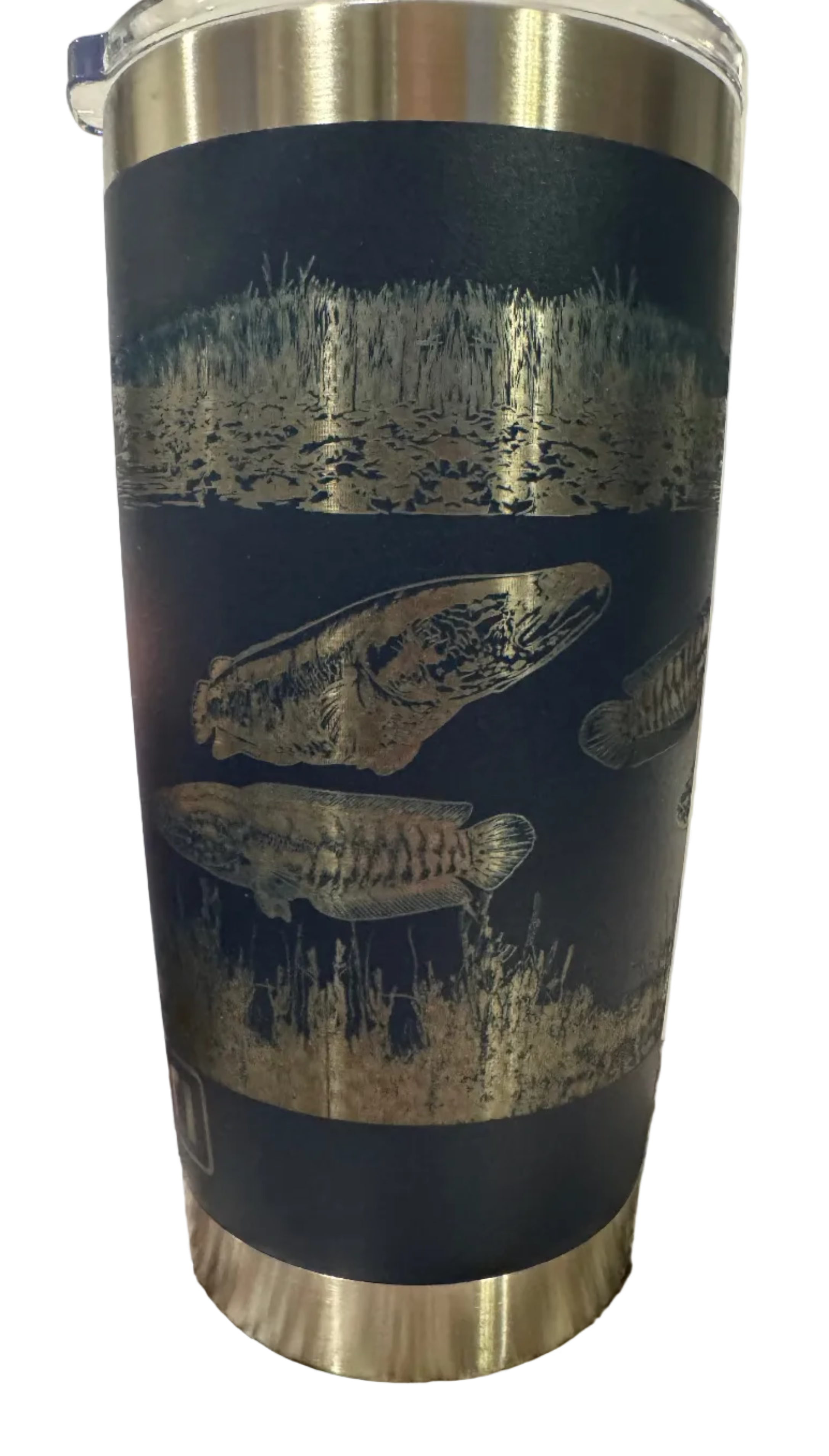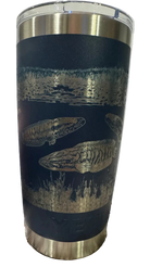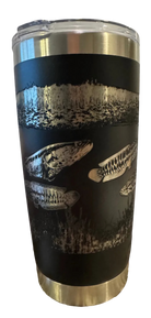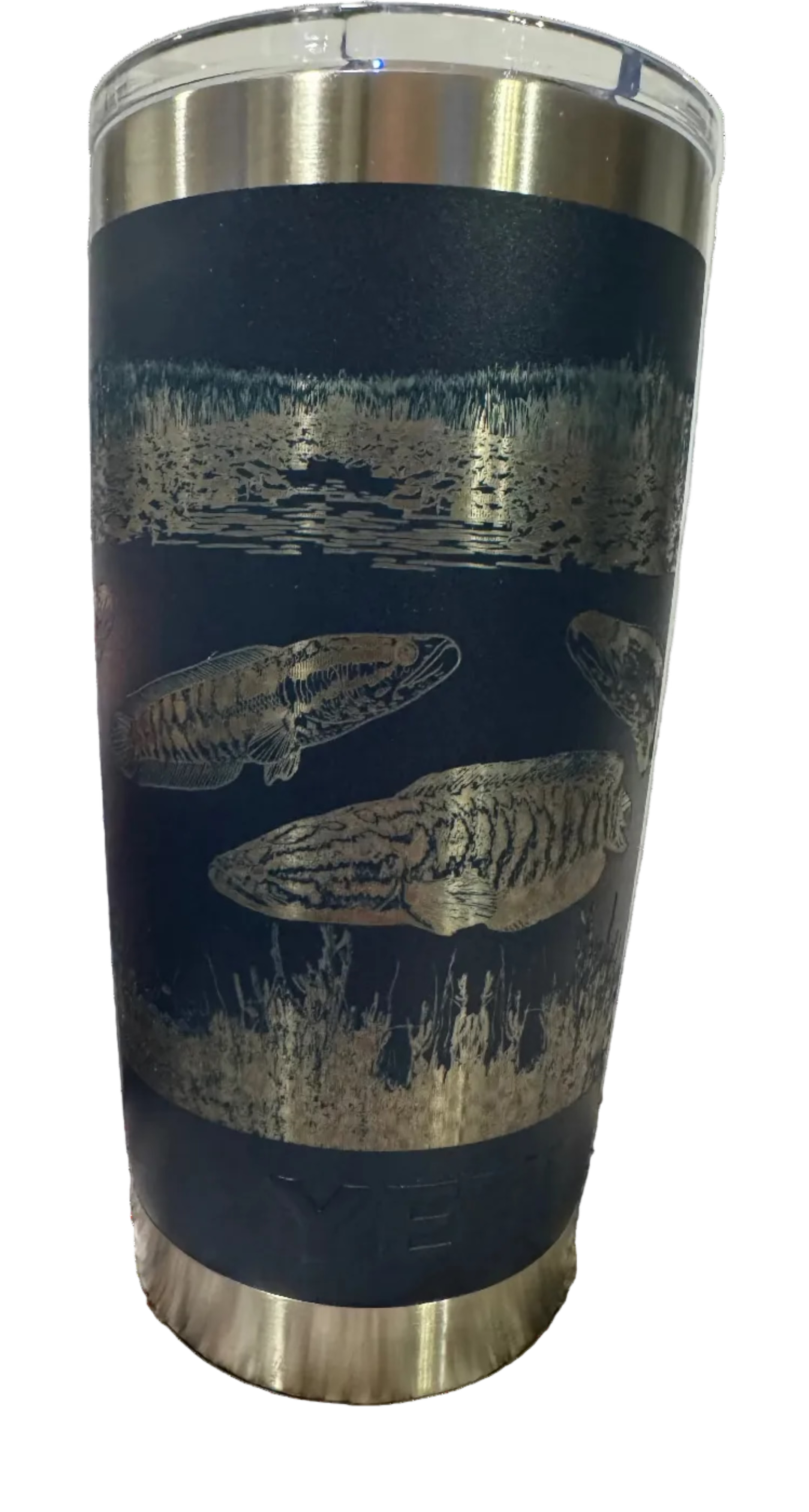 20oz Yeti Rambler Tumbler engraved with a wraparound Northern Snakehead underwater scene. From the grasses to the spatterdock lined reeds, this cup has everything we love about chasing these fish.