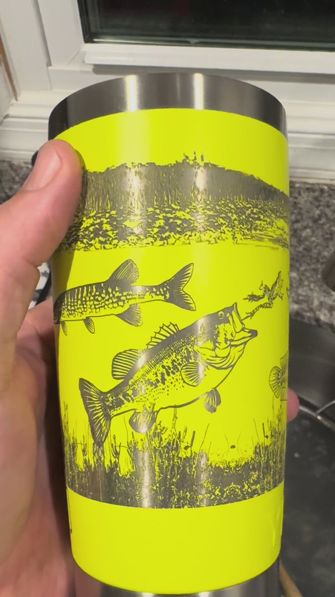 20oz Yeti Rambler Tumbler with our Freshwater Trifecta design engraved. Designed in house. Chain Pickerel, Bass, and Snakehead all playing nice together in an underwater paradise.